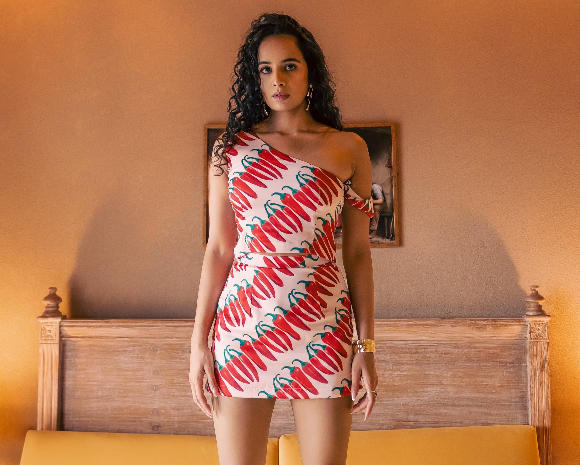 She’s Hot Like Mirchi 🔥 Custom Amós mirchi print, dripping on the dreamiest silk satin. A fiery one-shoulder top paired with a bold mini — straight, sleek, and unapologetically spicy.