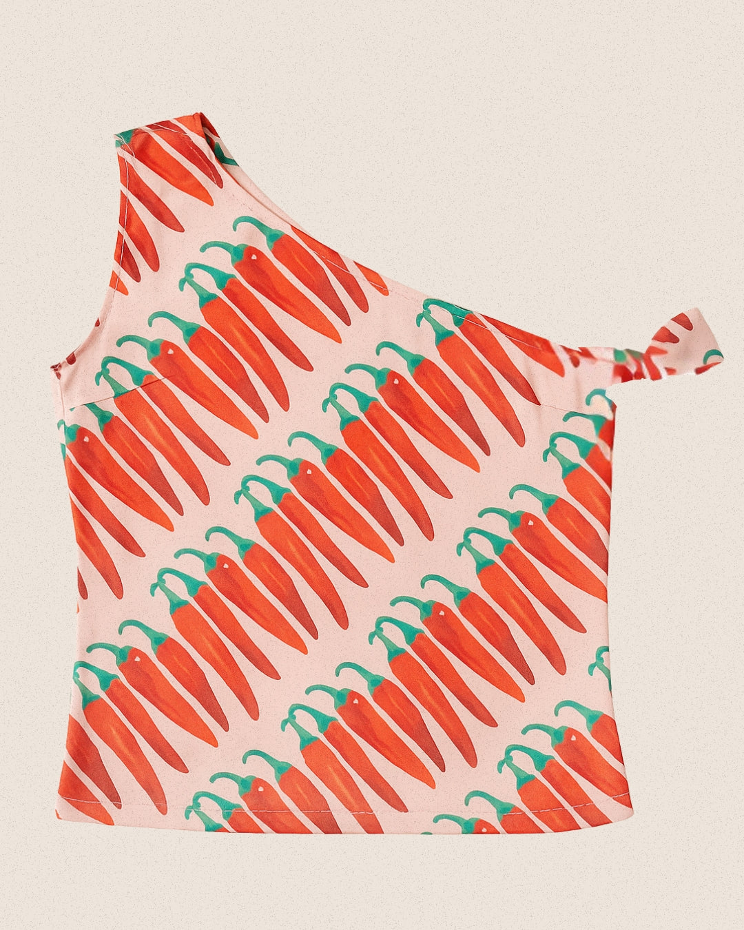 🔥 Hot Like Mirchi Top Turn up the heat in this fitted, cropped one-shoulder stunner. With its bold chilli print and sleek cut, this top is made to spice up any look