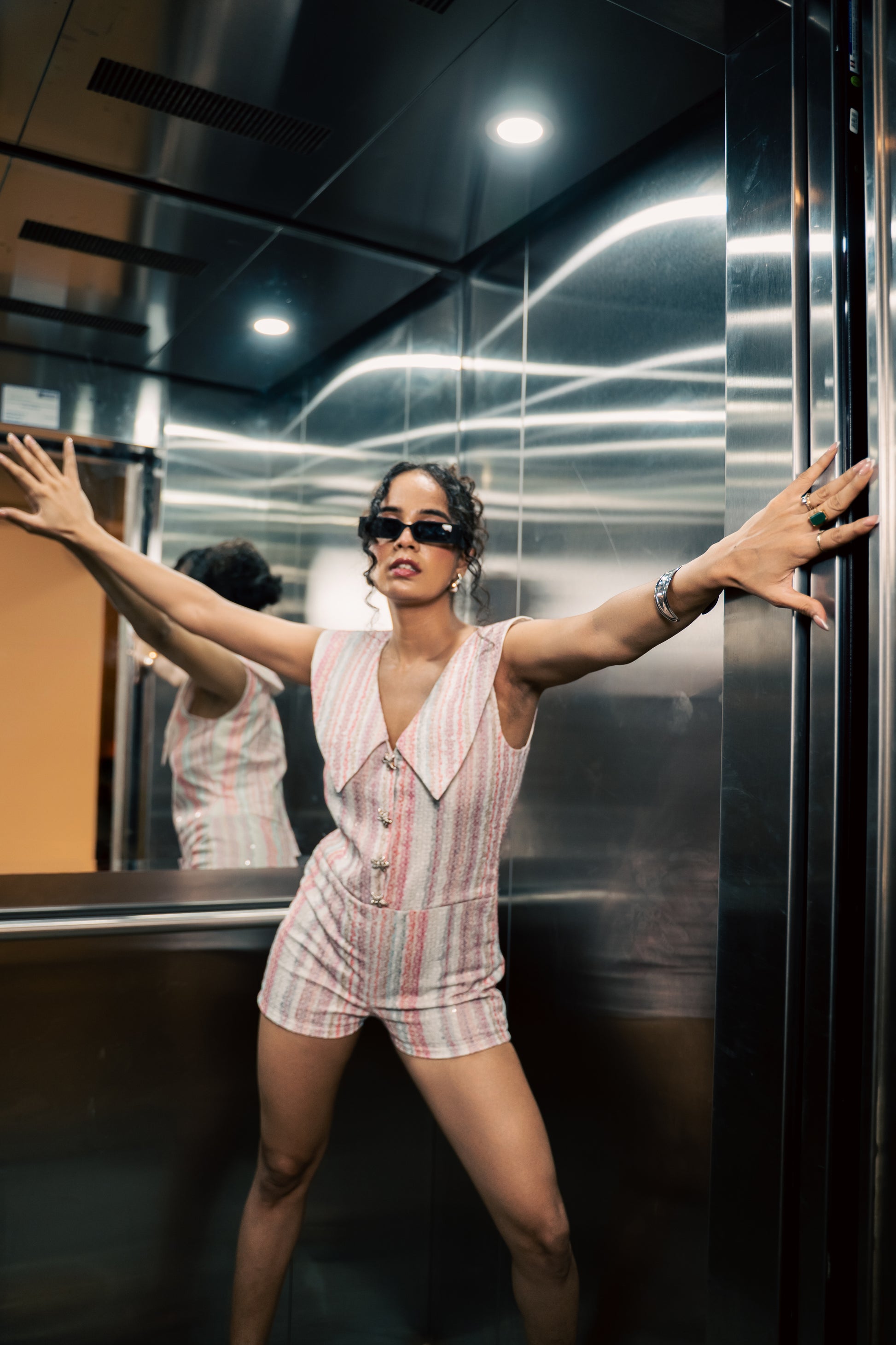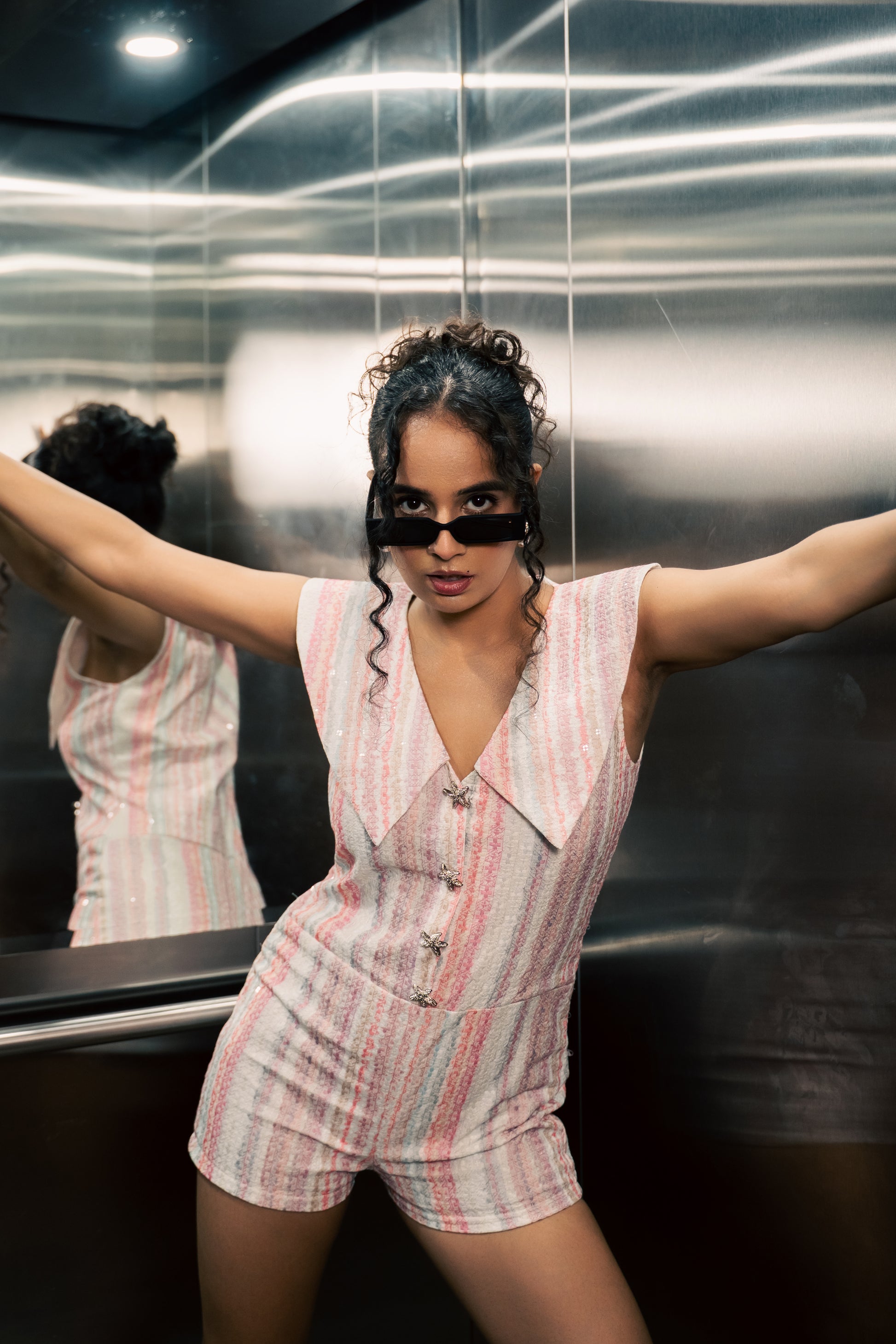 Where legacy flirts with now ☀️ Crafted in hand-embroidered Chanderi silk, the Sunset Playsuit mixes tradition with a little tease. Cool-toned summer stripes, starfish buttons, and vintage collar drama — it’s equal parts heirloom and head-turner. Made to move, made to glow, made to be lived in.